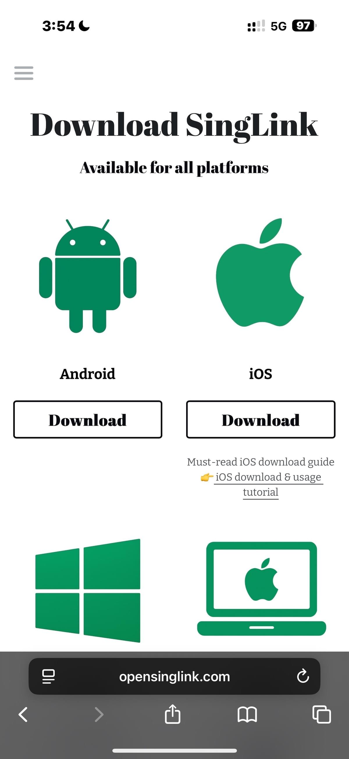1. Go to the site SingLink.com and tap Download iOS Client.